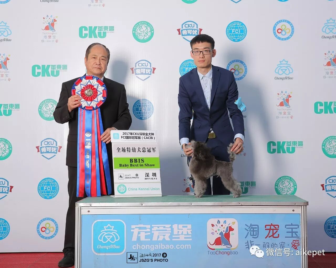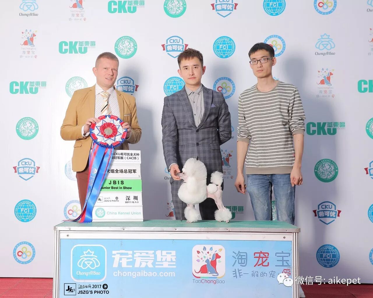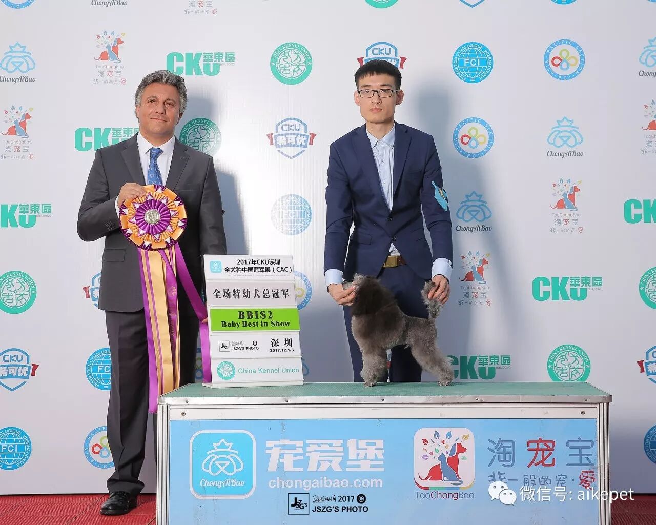 我们繁殖的灰色玩具贵宾犬——灰熊先生,受到来自2个国家的审查员的青睐,在此次犬展中,共报名2场全部入选,一次取得组BBIS(特幼组全场总冠军第1名),